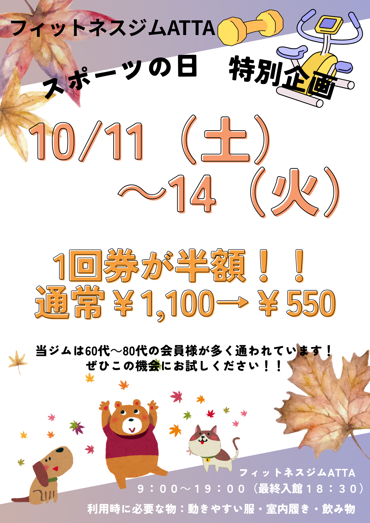 10/11(土)~10/14(火)スポーツの日特別企画開催🎉